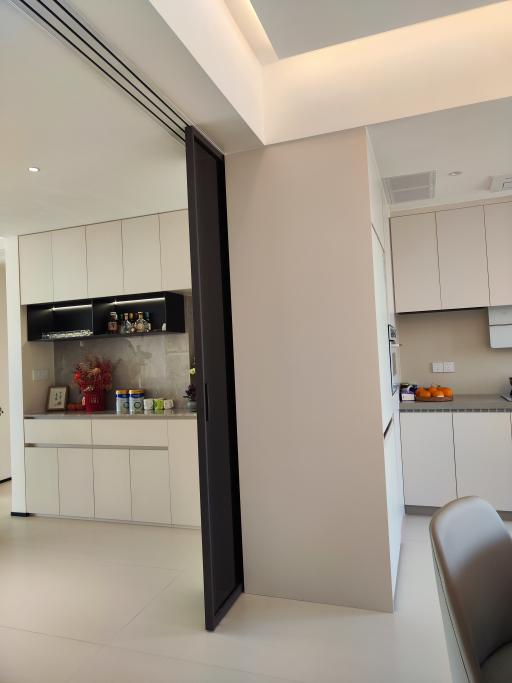 Dengan mengeluarkan dinding partisi yang tidak perlu, ruang tamu, makan, dan dapur disambungkan untuk mencapai reka bentuk ruang bersepadu. Walau bagaimanapun, untuk mengasingkan asap dapur dan bunyi bising, pemilik masih memilih untuk menambah pintu gelangsar di tengah -tengah ruang makan - ruang makan. Gantung yang sempit - Gantung yang tergelincir Tiga - Pintu Sinpolo yang tidak dapat dilihat dapat disembunyikan sepenuhnya di kabinet yang disesuaikan apabila ditolak ke satu sisi. Lagu ini tertanam dan diintegrasikan dengan permukaan siling. Reka bentuk tanpa landasan tanah membolehkan melalui jubin lantai, menjadikan pembersihan lebih mudah.